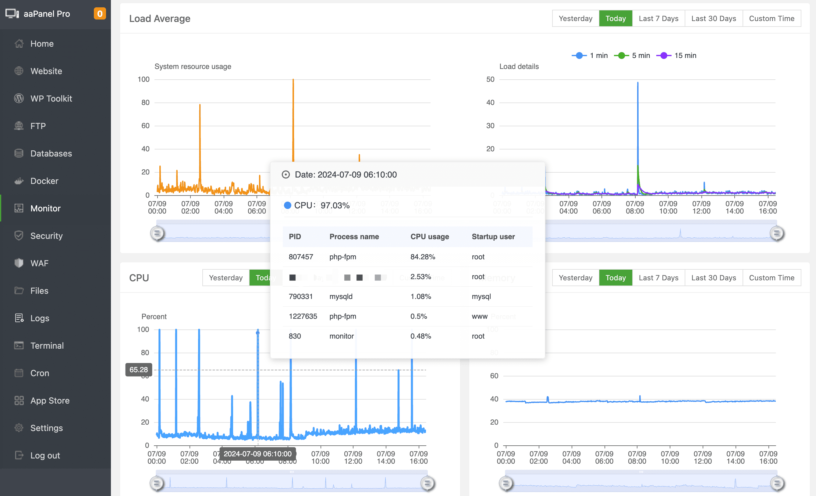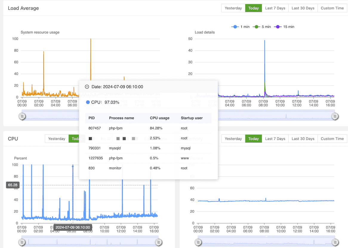 CPU, RAM, Disk IO, Network IO monitoring, you can set the number of days to save the record and check the data of a certain day at will.